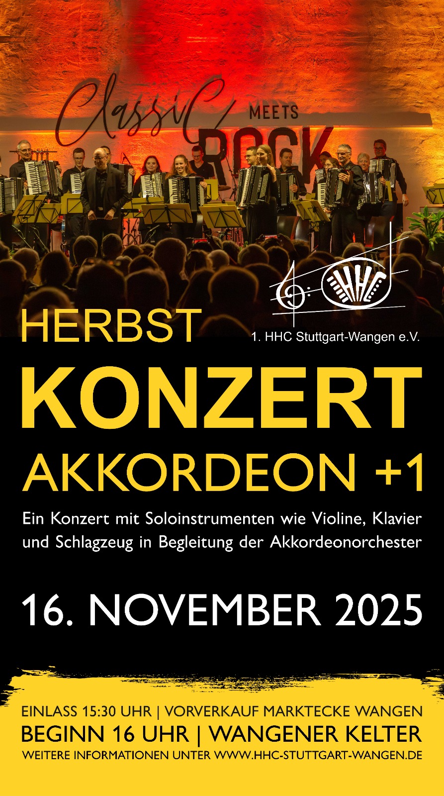 Das diesjährigen Herbstkonzert unter dem Motto „Akkordeon +1“ findet am Sonntag, dem 16. November 2025, in der Wangener Kelter in der Ulmer Straße 334 in 70327 Stuttgart-Wangen statt. Einlass ist um 15.30 Uhr, Beginn um 16.00 Uhr. Karten gibt es im Vorverkauf bei den Vereinsmitgliedern und in der Marktecke in der Ulmer Str. 360 in Stuttgart-Wangen.